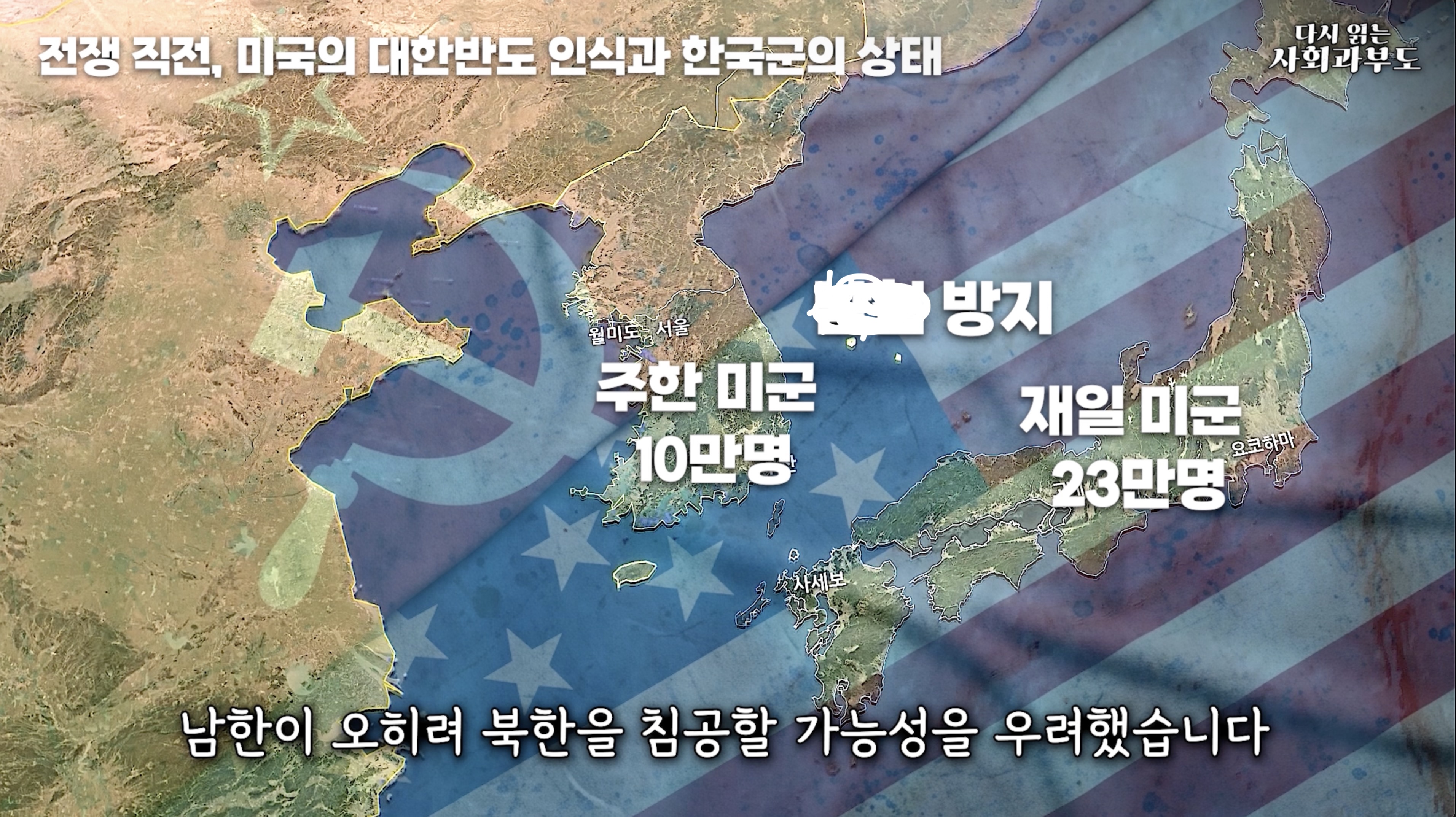 미국은 전쟁 전에 한국에게 무엇을 주었고, 무엇을 주지 않았을까요? 놀랍게도, 미국은 전쟁 전에 남한이 오히려 북한을 침공할 가능성을 우려했습니다. 그래서 한국에 공격용 무기, 예를 들면 탱크, 전투기, 중포 같은 것들은 거의 주지 않고, 오직 방어용 무기만 지원했습니다. 이것은 미국이 한국 독자적으로 북진 통일을 시도하는 것을 강하게 막으려 했던 의도가 있었습니다. 미국 군대는 전쟁이 나기 직전에 어디에 있었을까요? 1949년 6월, 미국은 주한미군을 대부분 철수시켰고, 아주 소수의 군사고문단만 남겼죠. 이것이 조선인민공화국이 남침을 결심하는 데 큰 영향을 미쳤다고 보는 관점도 있죠. 당시 미국은 한반도가 자신들에게 전략적으로 중요성이 낮다고 판단했던 것으로 보입니다. 즉, 전쟁 직전 미국은 한국을 중요하게 생각하지 않았고, 오히려 남한의 북진을 경계했던 것이죠.