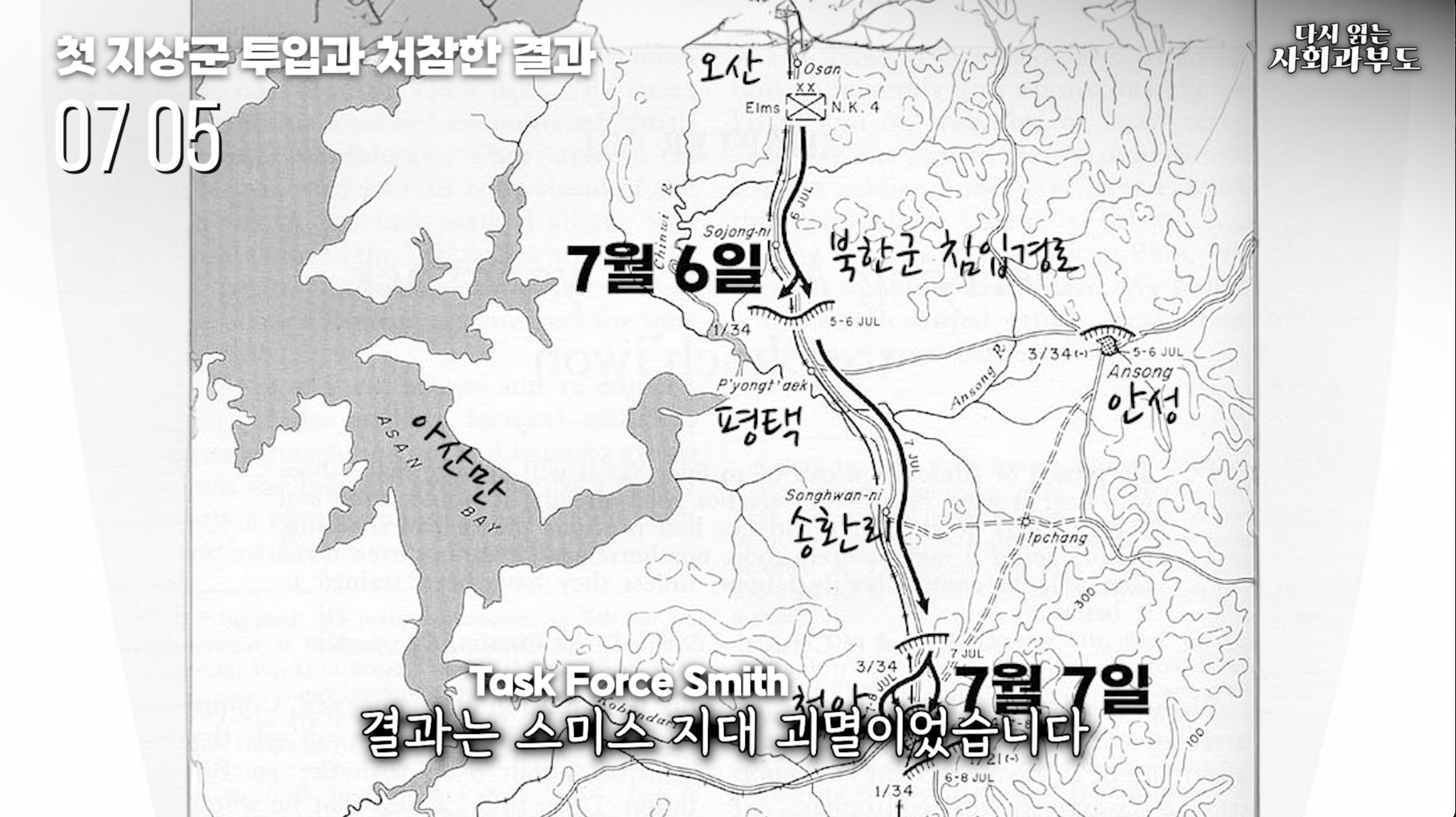 세계 최강이라 불리던 미군은 사실 어떤 상태였을까요? 첫 미국 지상군이 한국에 도착했을 때, 과연 승리했을까요? 상황이 심각해지자 일본에 주둔하고 있던 미군의 선발대, **스미스 특수 임무 부대(스미스 지대)**가 급히 투입되었습니다. 이 부대는 7월 1일에 부산에 도착했고 다음 날 대전으로 이동했습니다. 그리고 7월 5일 오전 8시 16분, 스미스 부대 포병이 한국 전쟁에서 미군이 발사한 첫 탄을 쐈습니다. 북한군의 T-34 전차를 향한 것이었죠. 하지만 스미스 지대의 60mm 바주카로는 소용이 없었습니다. 결과는 스미스 지대의 괴멸이었습니다. 그들은 탄약은 소총 1개당 120발, 식량은 2일분만 가지고 있었다고하죠. 그야말로 준비 안 된 상태에서 급하게 투입되어 처참한 패배를 맛본 겁니다.
