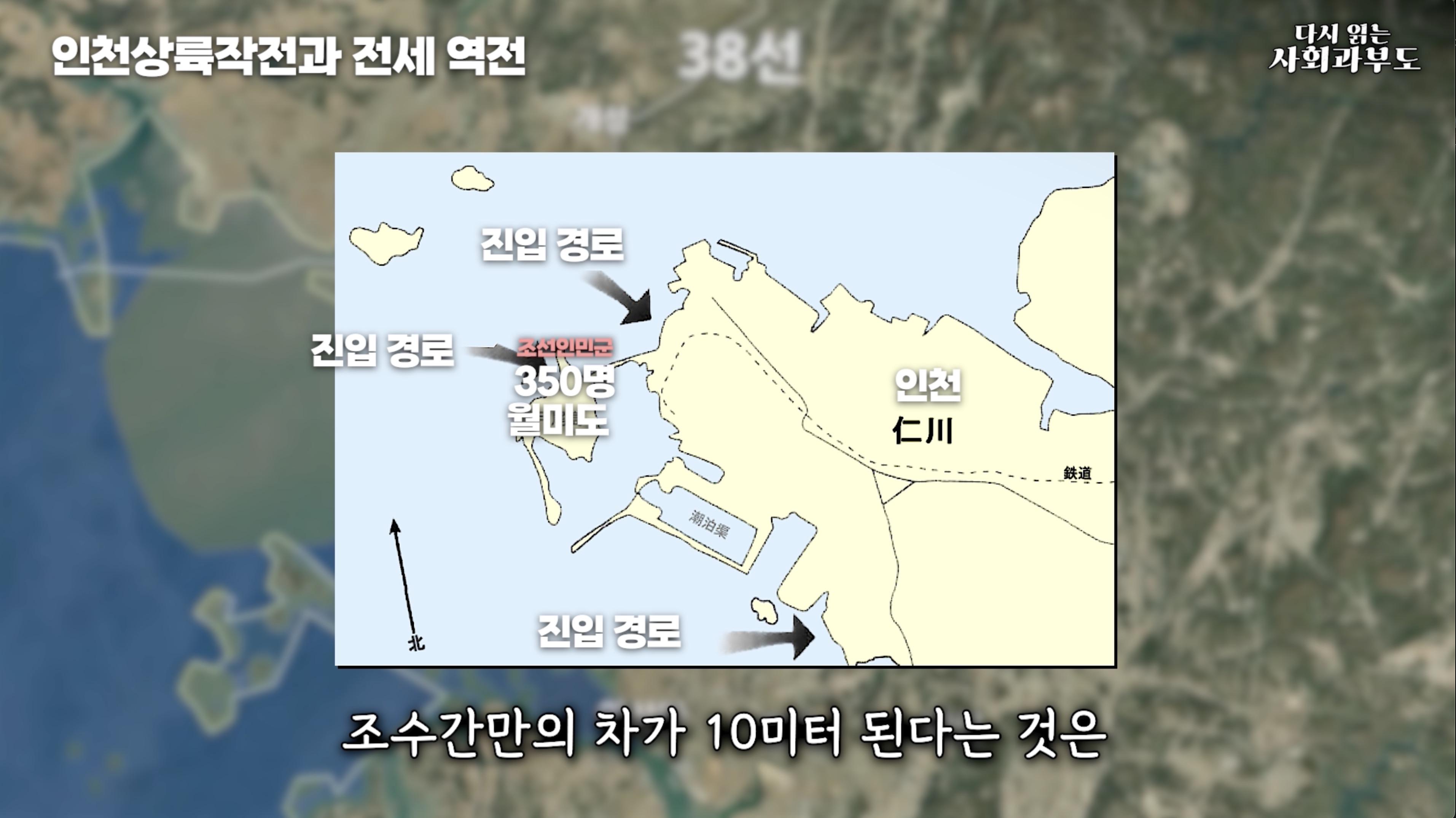 전선이 낙동강으로 밀려 있던 7월 10일, 맥아더는 한반도 지도에서 인천을 지팡이로 두드리며 상륙 지점으로 낙점했습니다. 하지만 미 합동참모본부는 인천이 서울과 가깝고 북한군 대병력이 있을 우려, 그리고 무엇보다 조수 간만 차가 심하고 물살이 빨라 상륙 작전에 매우 부적합하다는 점을 우려하며 반대하며 대신 군산을 제안하기도 했죠. 군산상륙작전이 될 뻔했죠. 실제로 위장 작전으로 군산 역을 B-26으로 폭격하기도 합니다.