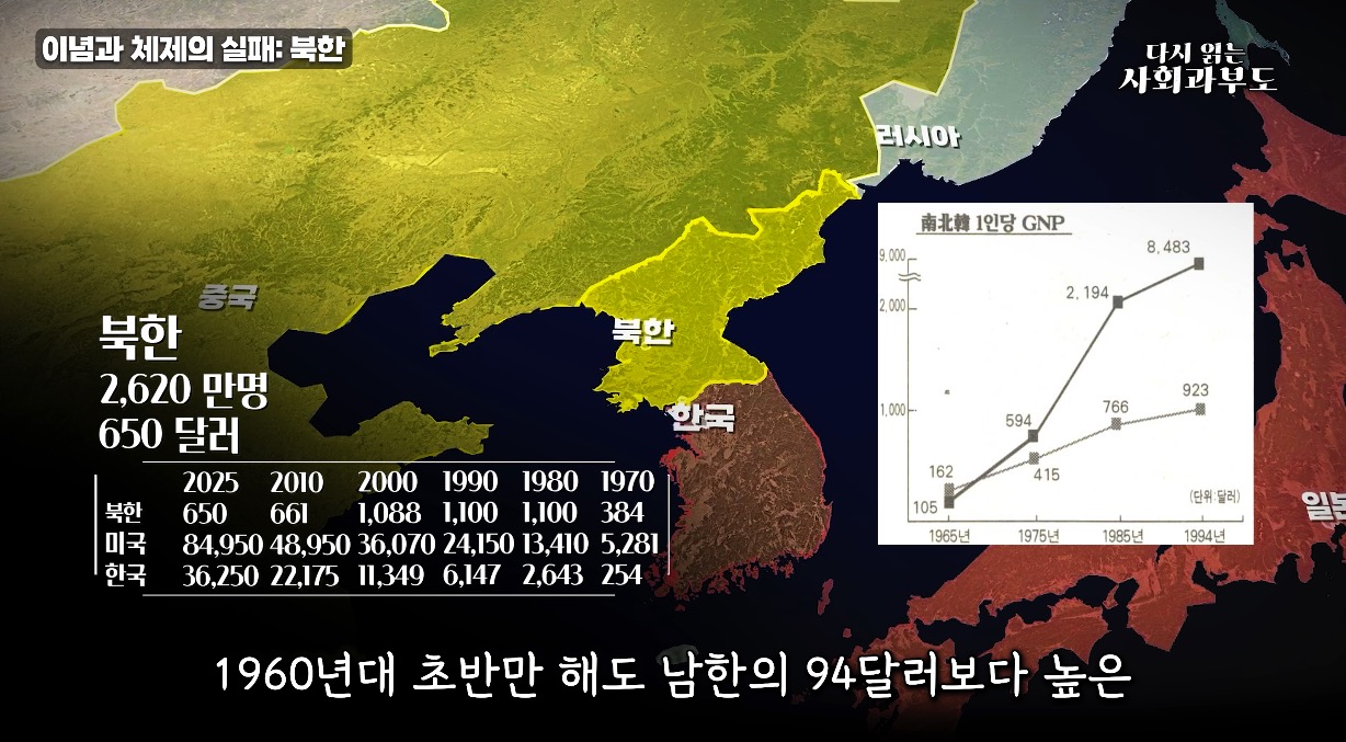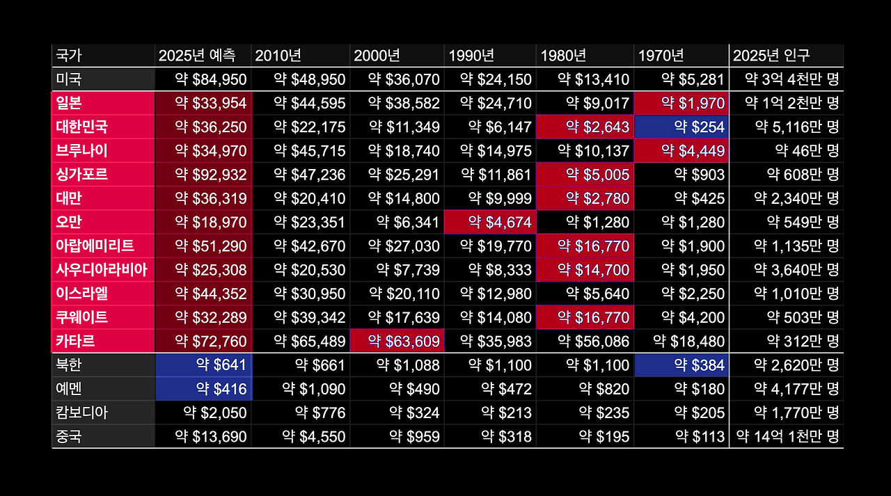 믿기 어렵겠지만, 북한은 1960년대, 1970년대 중반까지만 해도 남한보다 부유한 나라였습니다. 그러나 이후 계획 경제와 산업 정체, 그리고 '고난의 행군'으로 수백만 명의 아사자를 낳는 비극을 맞았습니다. 그런데도 핵무기에 집착하는 기형적인 모습은, 잘못된 선택이 얼마나 처참한 결과를 초래하는지 보여주는 살아있는 증거입니다. 우리의 사랑하는 젊은 세대는 태어나자마자 잘사는 나라에 살고있지만, 오늘 우리가 누리는 이 풍요와 평화는 결코 당연한 것이 아닙니다. 과거 우리 선조들이 피와 땀으로 일궈낸 '부국강병'의 결과이며, 수많은 시행착오 끝에 얻어낸 소중한 유산입니다. 이 아시아의 극명한 대비는 우리에게 중요한 교훈을 남깁니다. 지속 가능한 발전은 결국 안정된 사회와 합리적인 시스템, 그리고 사람을 가장 중요한 자산으로 여기는 곳에서 시작된다는 사실 말입니다.