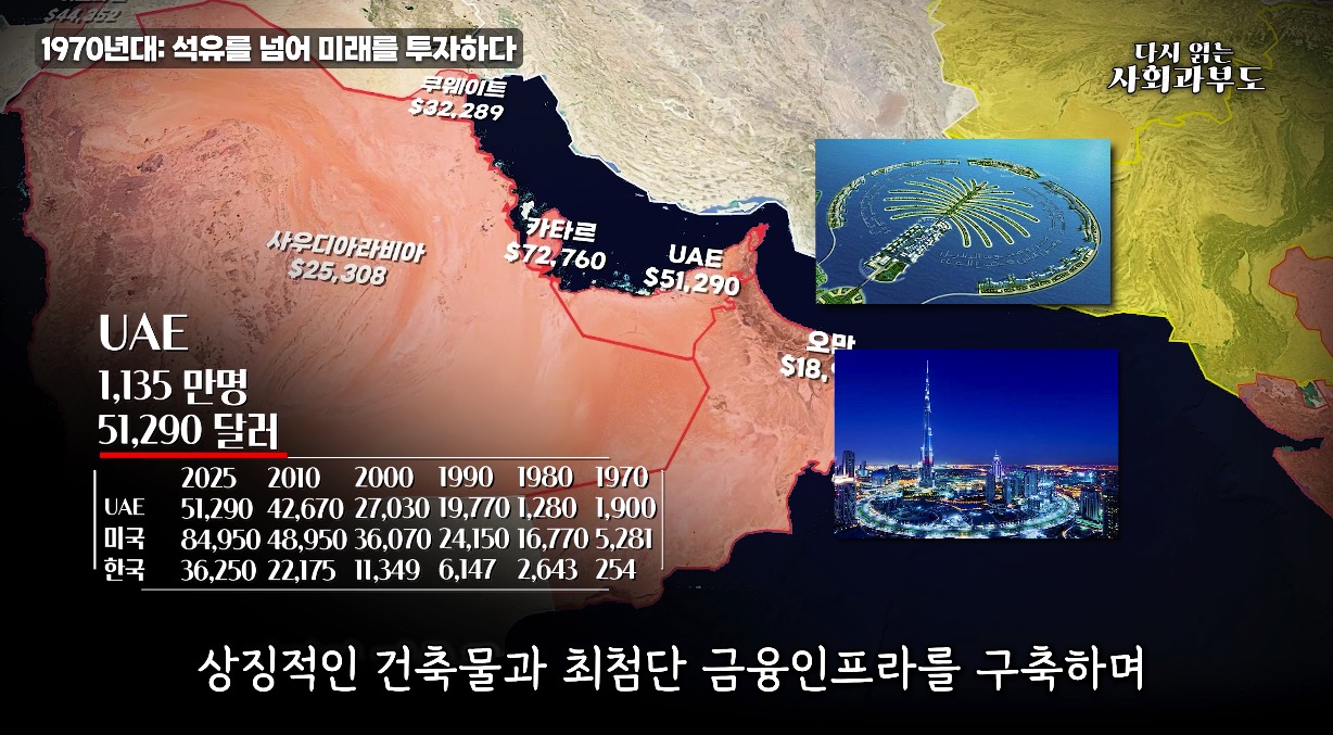 UAE는 아부다비와 두바이가 주도하여 결성된 7개 토후국 연방국가로, 1970년대 영국의 철수 이후 연방을 결사하여 풍부한 석유와 천연가스 자원을 통해 막대한 부를 축적했습니다. 특히 두바이는 1966년 석유를 발견한 후, 1970년대부터 금융, 무역, 관광, 부동산 등 비석유 분야를 집중적으로 육성하며 경제 다각화를 선도했습니다. 팜 주메이라, 부르즈 할리파와 같은 상징적인 건축물과 최첨단 금융 인프라를 구축하며 전 세계 부유층과 기업을 끌어들이는 데 성공하며 다른 GCC 국가들보다 훨씬 빠르게 석유 의존도를 낮췄습니다. 막대한 부를 미래를 위한 인프라 투자로 연결한 것이 결정적이었습니다.