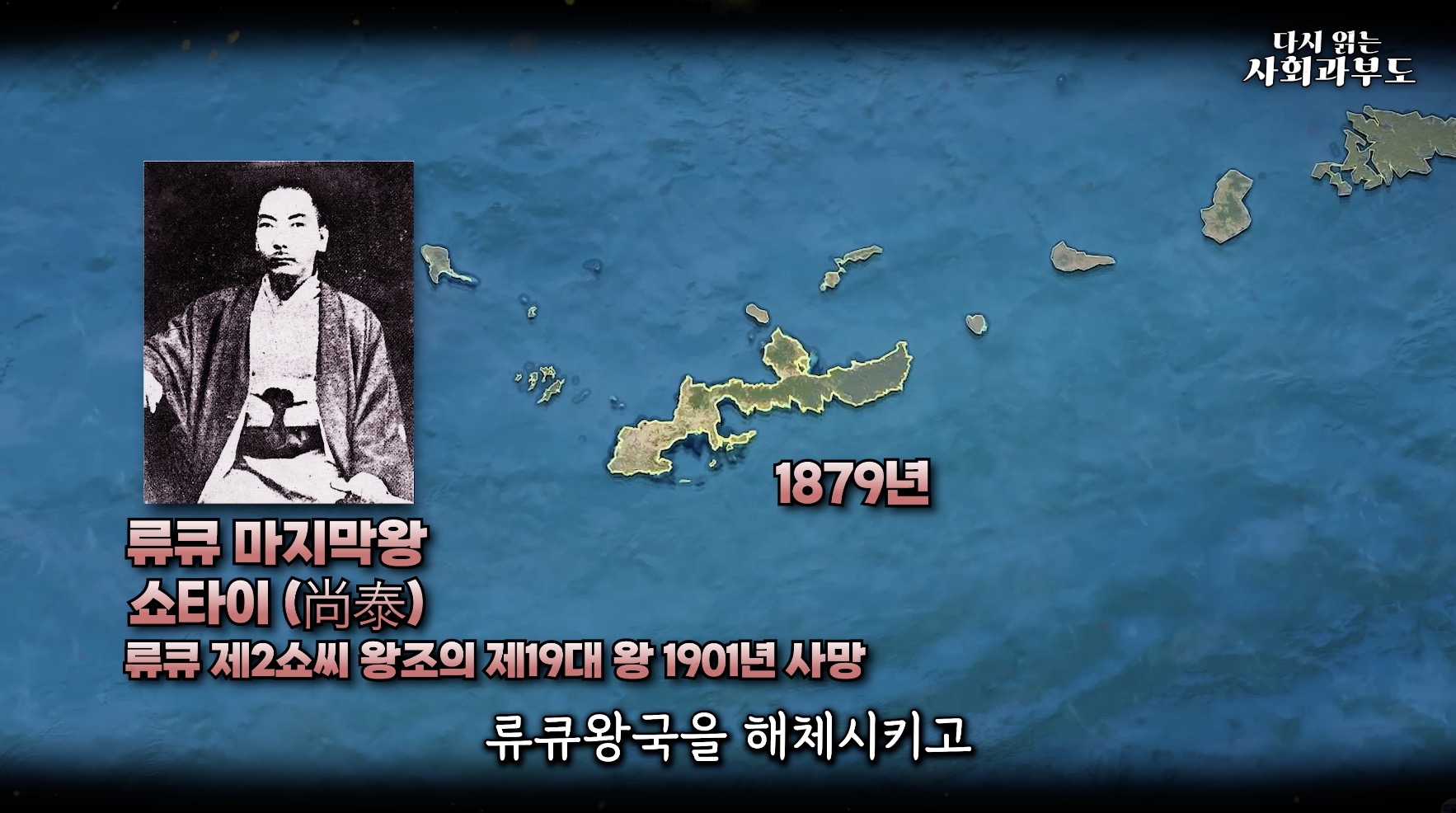 1879년이었어요. 류큐 왕국은 예전부터 중국이랑 일본 양쪽에 다 조공을 바치던, 반독립 상태의 나라였어요. 하지만 메이지 정부는 1879년에 군대를 보내서 류큐 왕국을 아예 해체해 버리고, '오키나와현'을 설치하면서 류큐 제도를 강제로 일본 영토에 집어넣었습니다. 이건 일본의 서남쪽 국경을 확정하려는 목적이 있었죠.