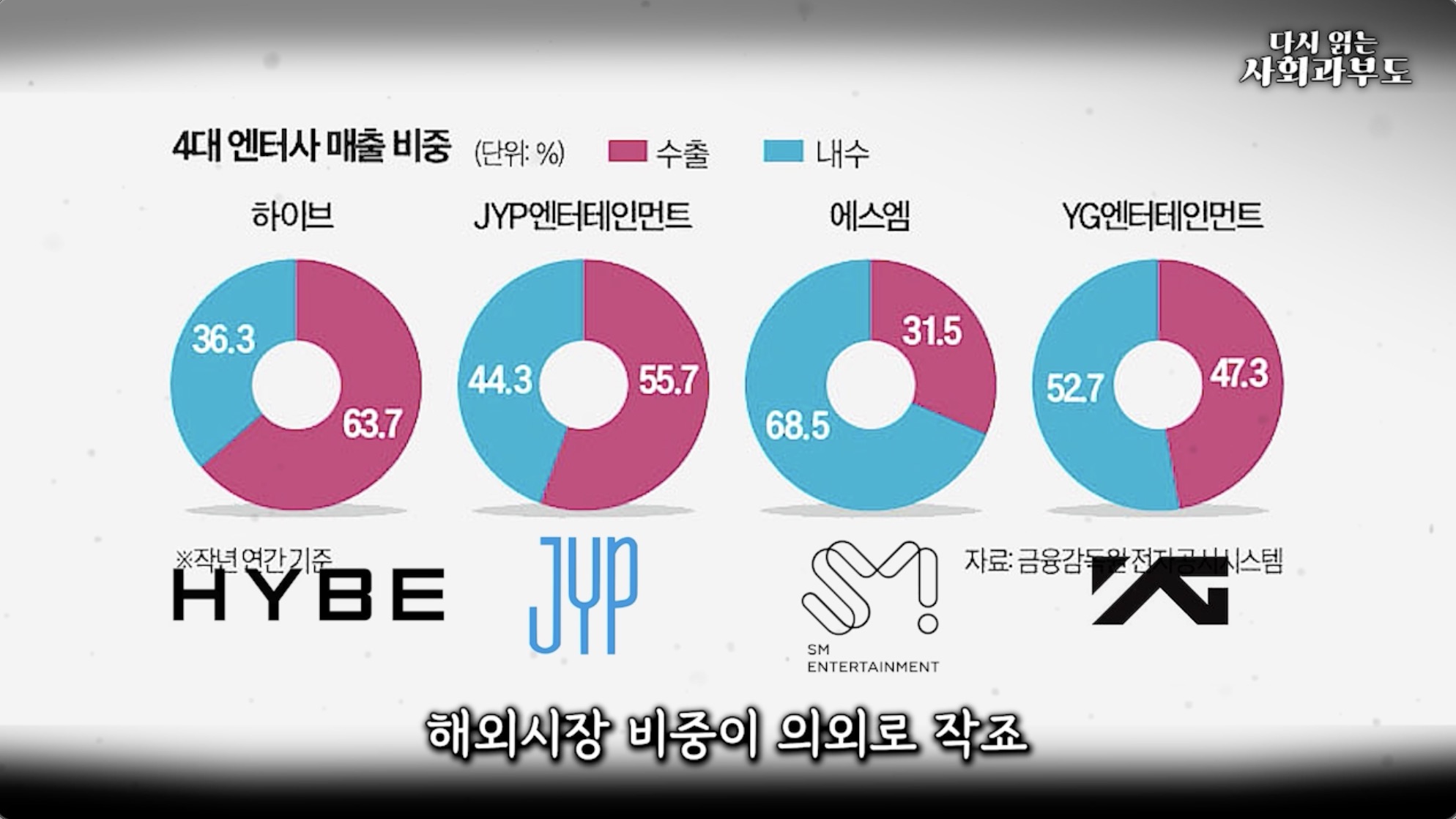 왜냐하면 최근 한류로 K팝과 엔터테인먼트가 효자 산업 같지만, 하이브나 JYP도 60% 수준이며 YG도 50%, SM도 30%에 그쳐 해외 시장 비중이 의외로 작습니다. '케이팝 데몬 헌터스'나 '오징어 게임'으로 한국이 가져갈 비중이 10%나 될까요? 물론 소위 말하는 간접적인 경제 효과 같은 건 있겠죠. 2024년 기준으로 현대차는 총 414만여 대의 차량을 판매했는데, 이 중 무려 343만여 대가 해외시장에서 팔렸습니다. 북미와 유럽 시장이 효자 역할을 하는데, 작년 현대차의 북미 지역 매출은 전년 대비 13.5%나 증가했고, 기아의 해외 시장 매출 비중도 70%에 육박하며 판매된 자동차 4대 중 1대가 미국일 정도로 미국 시장은 그룹 전체 매출에서 가장 큰 비중을 차지하는 고객입니다.