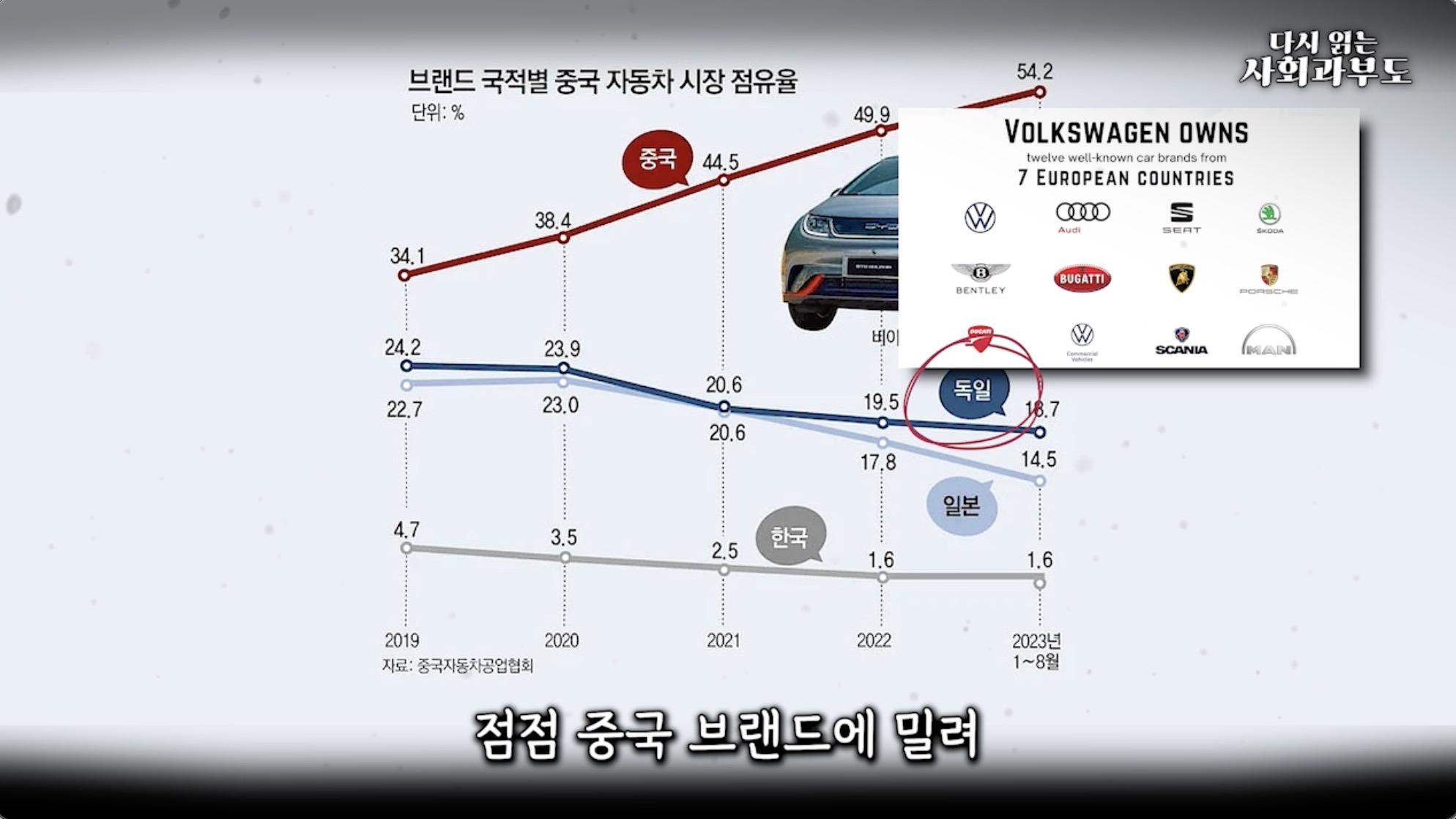 그런데 이런 현대, 기아차는 의외로 자동차 시장 규모가 큰 중국에서 점유율이 1%대로 매우 낮습니다. 중국은 자국 브랜드의 약진이 두드러지며, BYD가 전기차와 플러그인 하이브리드 차량으로 1위를 차지하고 있습니다. 지리 그룹이 자사 브랜드 및 볼보, 로터스 등 해외 브랜드를 인수하며 추격하고 있고, 유일하게 폭스바겐 그룹이 중국 시장의 전통 강자였지만 점점 중국 브랜드에 밀려 순위가 계속 하락하고 있습니다. 이런 중국 브랜드들은 한국 시장에도 진출하려고 애를 쓰고 있습니다.