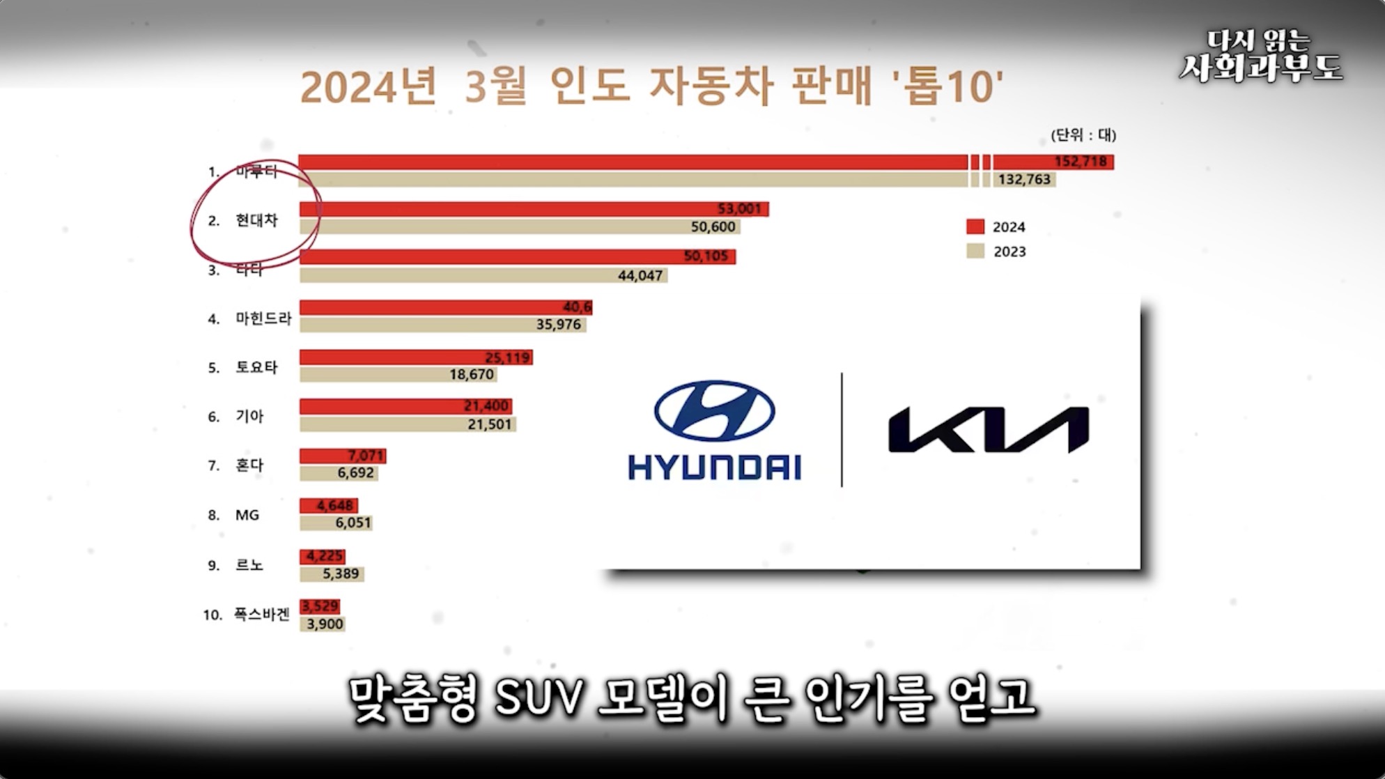 인도 시장은 세계 3위 규모로 1위는 스즈키와 인도 기업의 합작사인 마루티 스즈키로, 인도 시장에서 40% 이상의 점유율을 보입니다. 현대자동차는 2위로 크레타와 같은 맞춤형 SUV 모델이 큰 인기를 얻고 15%의 점유율을 기록하며, 특히 기아와 합산하면 20%를 넘습니다. 3위인 타타 모터스는 인도의 대표적인 자국 브랜드로 현대와 치열하게 2위 자리를 다투고 있습니다.
