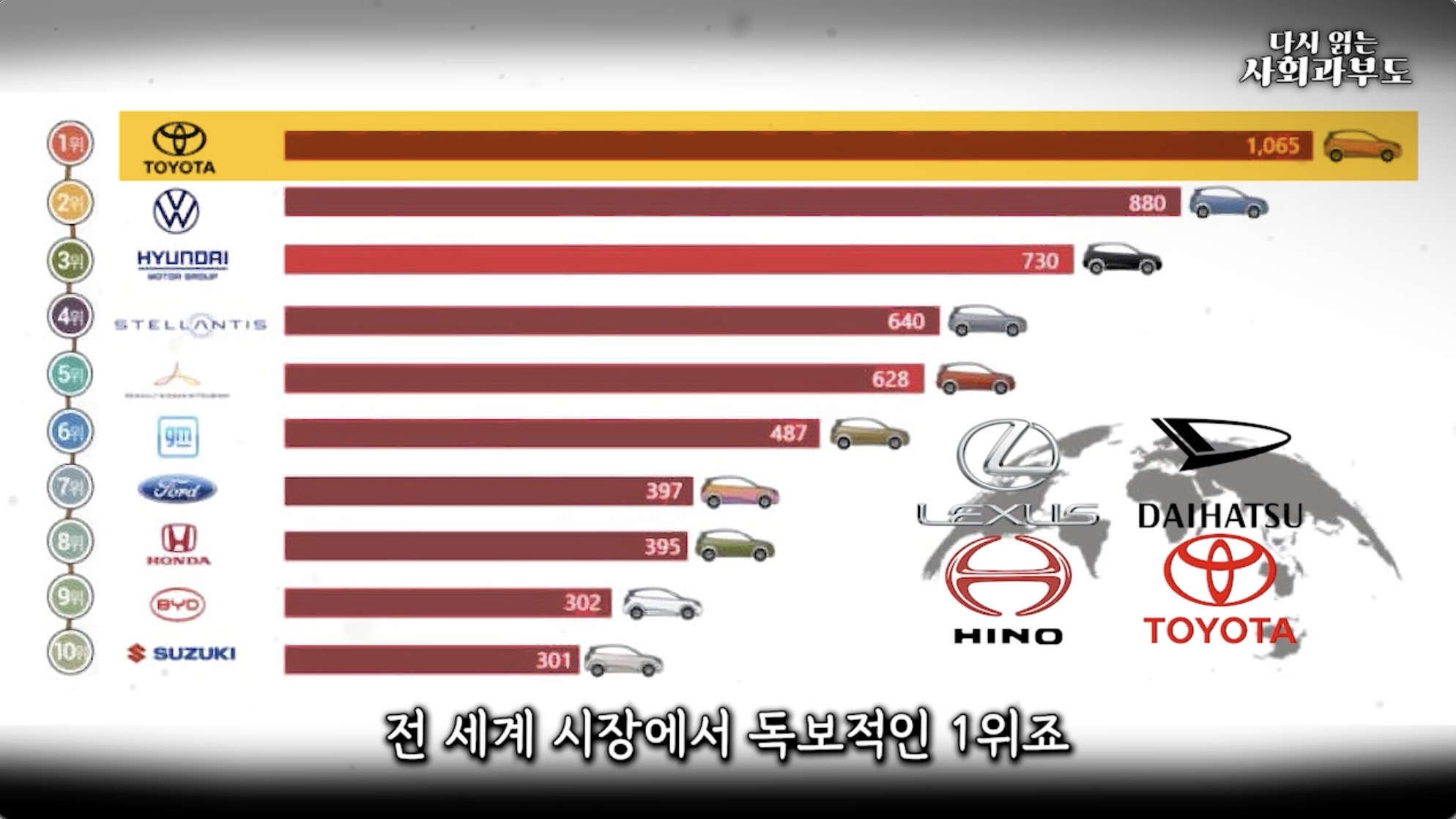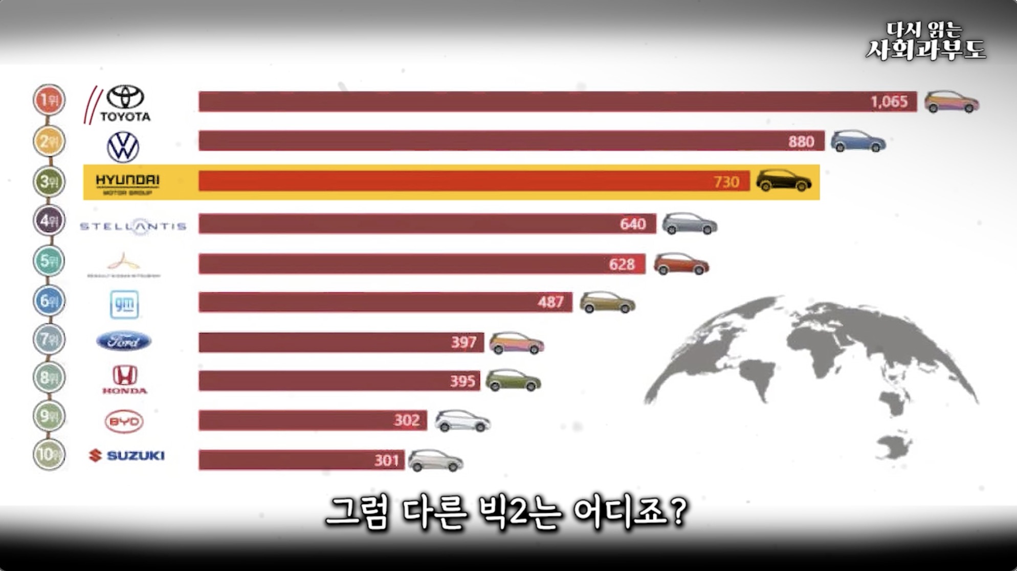 그럼 다른 빅2는 어디일까요? 일본의 도요타 그룹은 도요타, 렉서스, 다이하츠 등으로 라인업을 구분하여 전 세계 시장에서 독보적인 1위입니다. 독일의 폭스바겐 그룹도 폭스바겐, 아우디, 포르쉐, 스코다 등을 산하에 두고 있으며 유럽 시장을 기반으로 2위를 차지하고 있습니다. 또한 독일은 고가의 메르세데스 벤츠나 BMW와 같은 고급 승용차 브랜드가 글로벌 200만 대 이상 판매되고 있습니다.