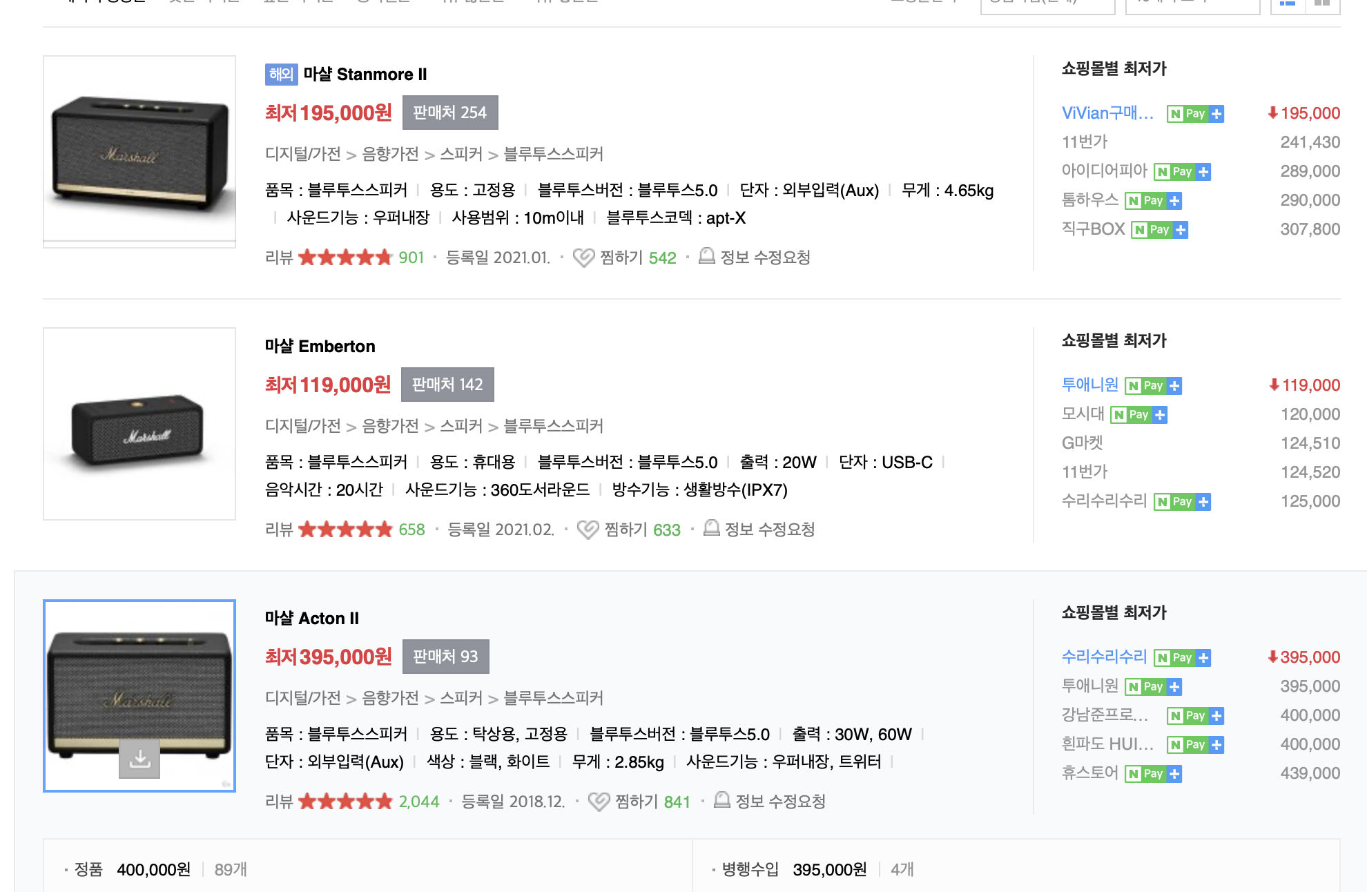 네이버에서 마샬스피커 해외직구 검색하면 직구로 저렴하게 판매합니다. 정품에 비해 훨씬 싸기때문에 혹시나 고장이 나도 하나더사면 되는 가격입니다.