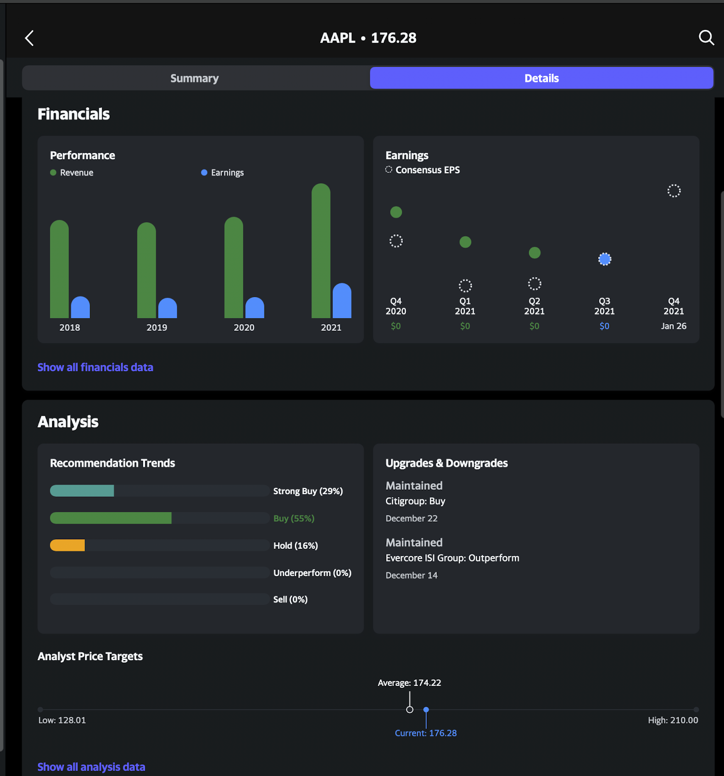 마지막으로 프라이스 타겟의 경우는 적정한 가격대가 얼마인지입니다. 평균 174불인데 현재주자는 176불이니 이미 주식이 오버되었다는 말입니다. 더 오를가능성이 있는지 없는지 고민해봐야할 수치입니다.
