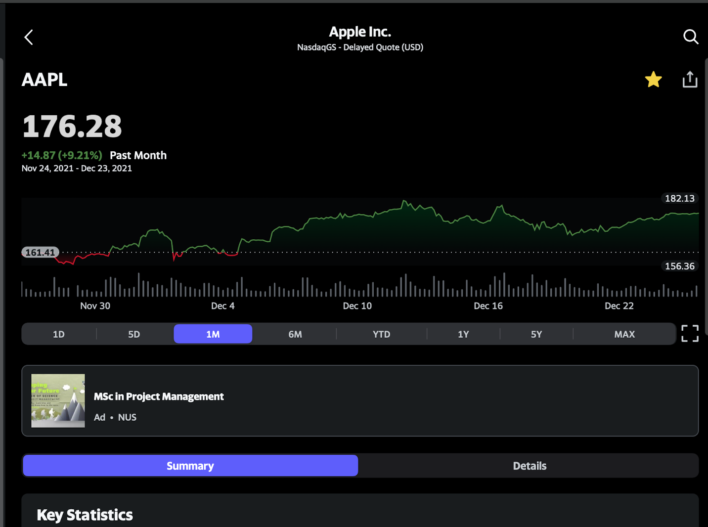 1M는 한달간 주식 변화입니다. 1달간 9.21퍼센트 올랐습니다. 한달전에 구매했다면 161.4불에 구매했으니 주당 약 15불의 수익이 났겠네요.