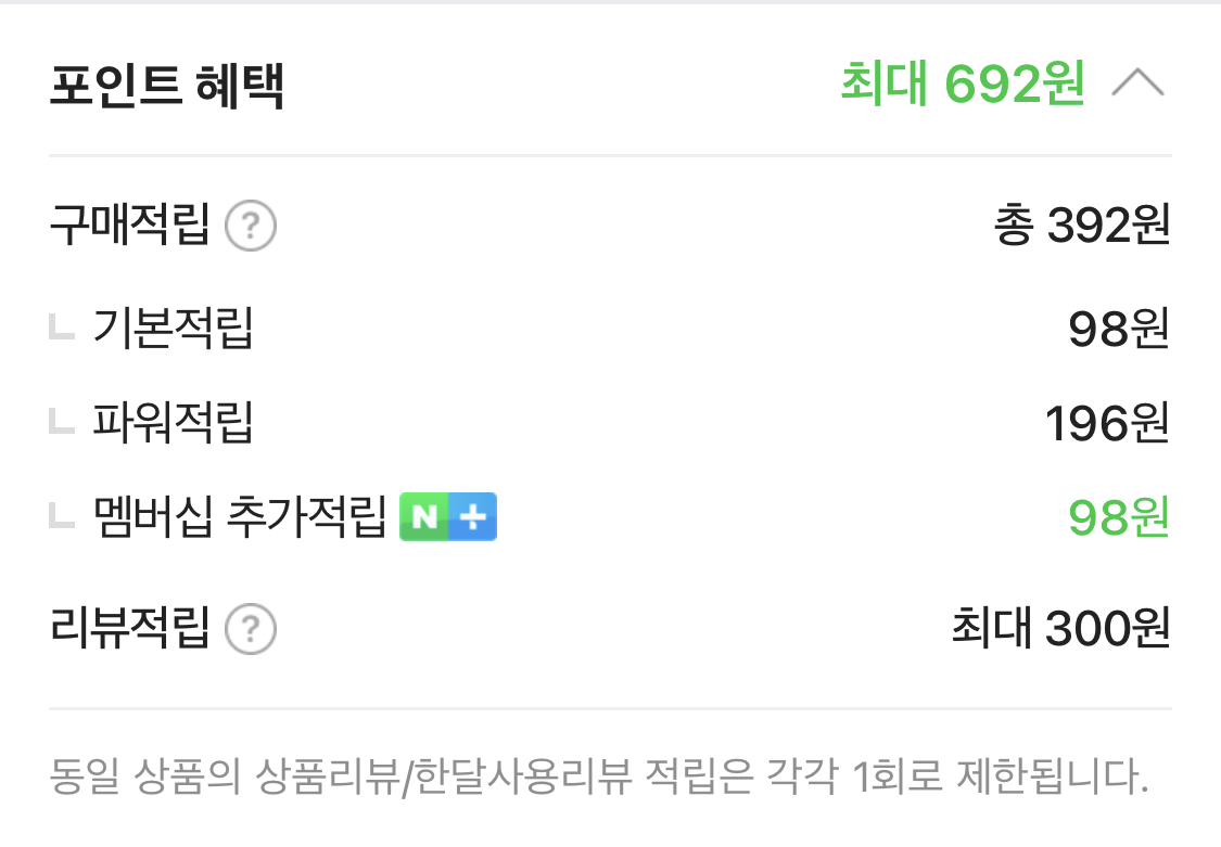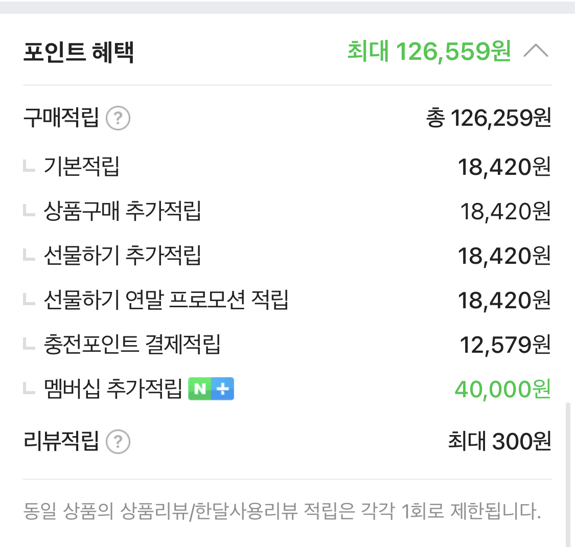 선물하기 적립 1% + 네이버페이 충전포인트 결제 적립 1% + 간편결제 적립(카드 포인트) + 파워적립 1% + 멤버십 추가적립 4% + 기본적립 1% + 리뷰적립(쇼핑몰마다 상이) +한달리뷰적립 (쇼핑몰마다 상이)