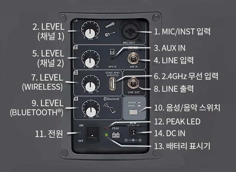 1. MIC/INST 입력 - 마이크, 반주 및 액티브 프리앰프 또는 라인 신호에 이 XLR/1⁄4" 입력을 사용하세요. 2. LEVEL (채널 1) - 채널 1 마이크/라인 입력의 레벨을 제어하는 데 사용됩니다. 3. AUX IN - 3.5mm 오디오 케이블을 사용하여 라인 레벨 장치를 연결하세요. 4. LINE 입력 - 기기 또는 라인 레벨 신호를 연결하는 데 사용되는 1⁄4" 입력. 5. LEVEL (채널 2) - MP3 IN 및 LINE 입력의 레벨을 제어하는 데 사용됩니다. 6. 2.4GHz 무선 입력* - 삼손 스테이지 XPD1 디지털 무선 USB 수신기를 이 입력에 연결하세요. 무선 수신기는 XP106에서 전원을 공급하므로 추가 전원 공급 장치가 필요하지 않습니다. 7. LEVEL (WIRELESS) - 2.4GHz 무선 입력의 레벨을 제어하는 데 사용됩니다. 8. 라인 출력 - 여러 XP106 시스템을 함께 연결하는 1⁄4" 출력 커넥터 9. LEVEL (BLUETOOTH®) - 블루투스 입력 수준을 제어하는 데 사용됩니다. 10. 음성/음악 스위치 - 이 스위치는 XP106 사운드 시스템의 전체 주파수 응답 또는 톤 윤곽을 변경하는 데 사용됩니다. 응용 프로그램이 주로 음악을 위한 것이라면, 스위치를 올려서 음악 응답 곡선을 선택하세요. 응용 프로그램이 주로 구어용인 경우, 스위치를 아래로 눌러 SPEECH 응답 곡선을 선택하십시오. 11. 전원 - 주전원을 켜세요. 12. PEAK LED - 빨간색 LED는 왜곡이 발생하는 수준에서 켜집니다. 13. 배터리 표시기 - 배터리 충전 수준 상태를 표시합니다. 14. DC IN - 제공된 전원 어댑터를 여기에 연결하세요. * USB 커넥터는 스테이지 XPD1 수신기 전용입니다. 커넥터는 스마트폰, 태블릿 또는 이와 유사한 장치를 충전하도록 설계되지 않았습니다.