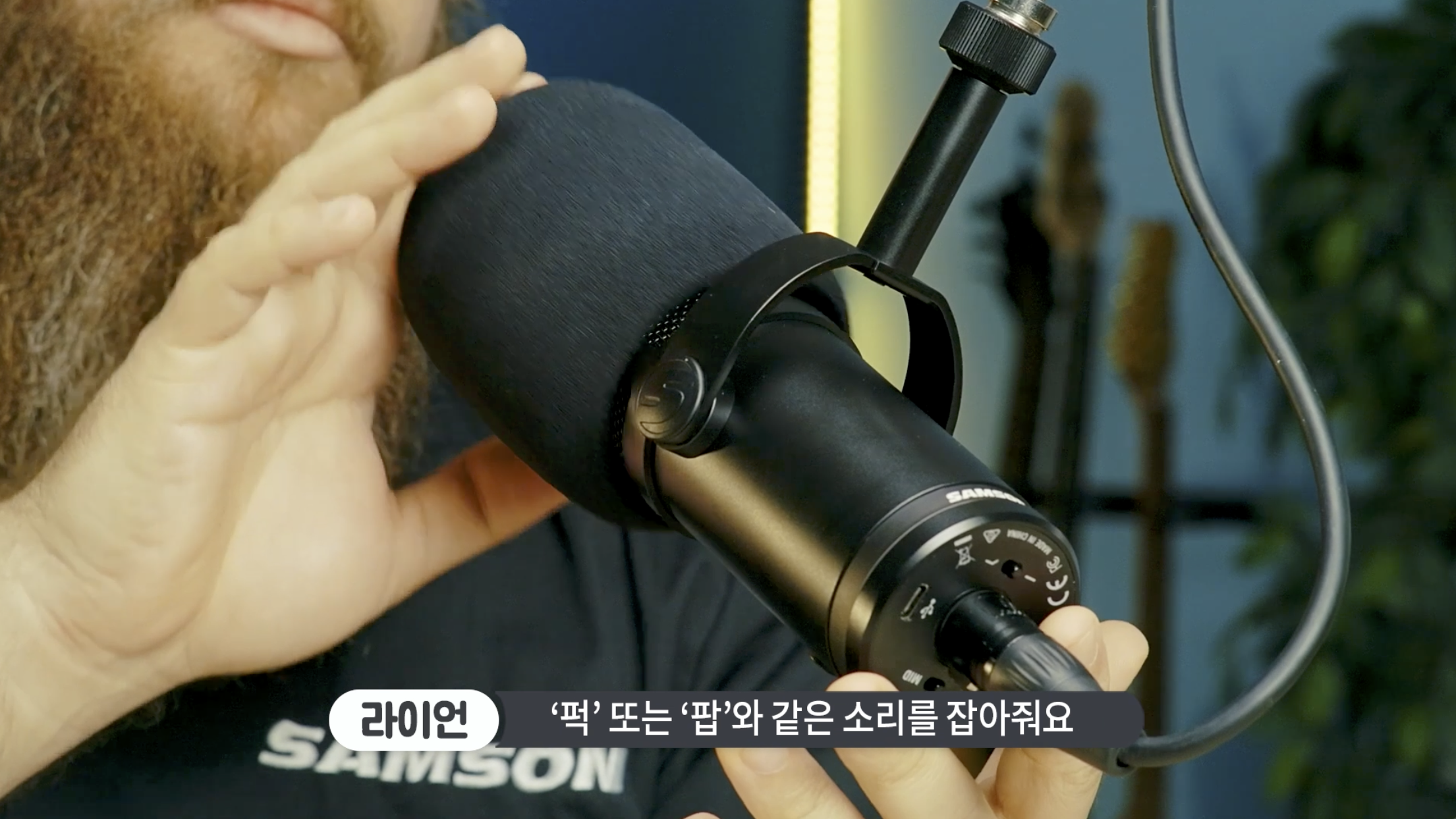 ‘펍’ 소리를 방지하기 위한 윈드 스크린을 이용하면 ‘퍽’ 또는 ‘팝’와 같은 소리를 잡아줘요. 당신의 목소리를 최적화 할 수 있는 또 다른 방법은 마이크 뒷쪽의 스위치를 활용하는 것인데요. ‘로우엔드 롤오프’와 ‘미드 범프’가 있어요