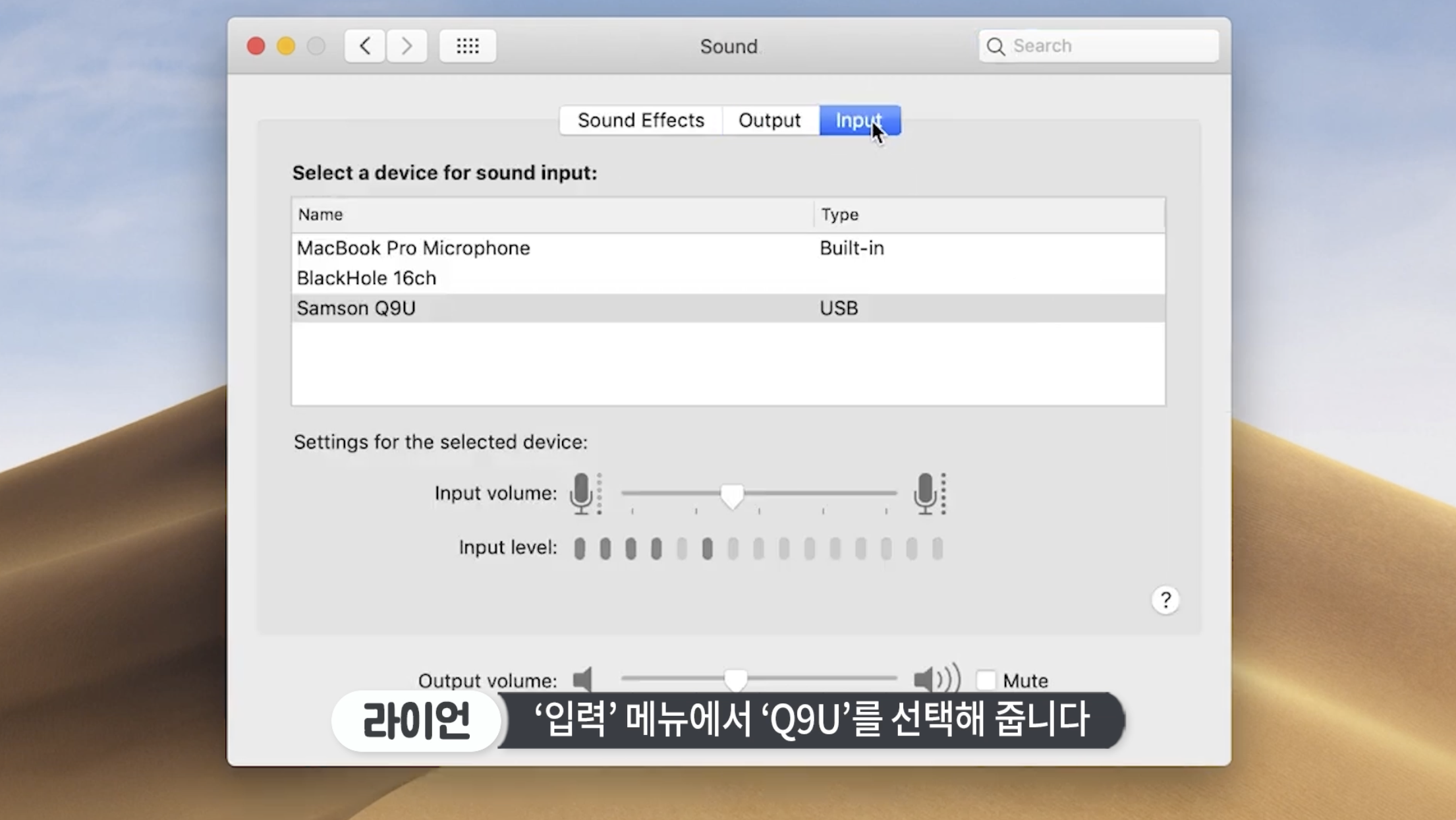 ‘시스템 환경설정’을 눌러주고 ‘사운드’를 눌러주세요. 입력 메뉴에서 Q9U를 선택해 줍니다. 마이크에 있는 헤드폰 출력을 사용하기 위해 Q9U가 출력 장치로 선택해 주시고요. 읽어주셔서 감사해요.당신이 무엇을 크리에이트할지 기대할게요.