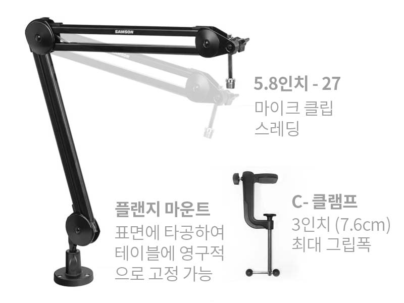 삼손 MBA38은 부드럽게 위치 조정이 가능한 마이크 데스크톱 스탠드입니다. 당신의 홈 스튜디오를 고급스럽게 변신시켜줍니다. 매우 견고한 소재와 구조의 붐 암으로서 유튜브 라이브 방송이나 라이브 커머스, 팟캐스트 또는 스트리밍 상황에서 원하는 위치로 마이크를 자유롭게 이동할 수 있습니다. 삼손 MBA 시리즈 붐 암은 책상이나 탁상에 부착하기 위한 C 클램프 마운트(3인치 최대 그립, 단 MBA18의 경우 2인치)와 테이블에 설치를 위한 플랜지 마운트가 함께 제공됩니다.
