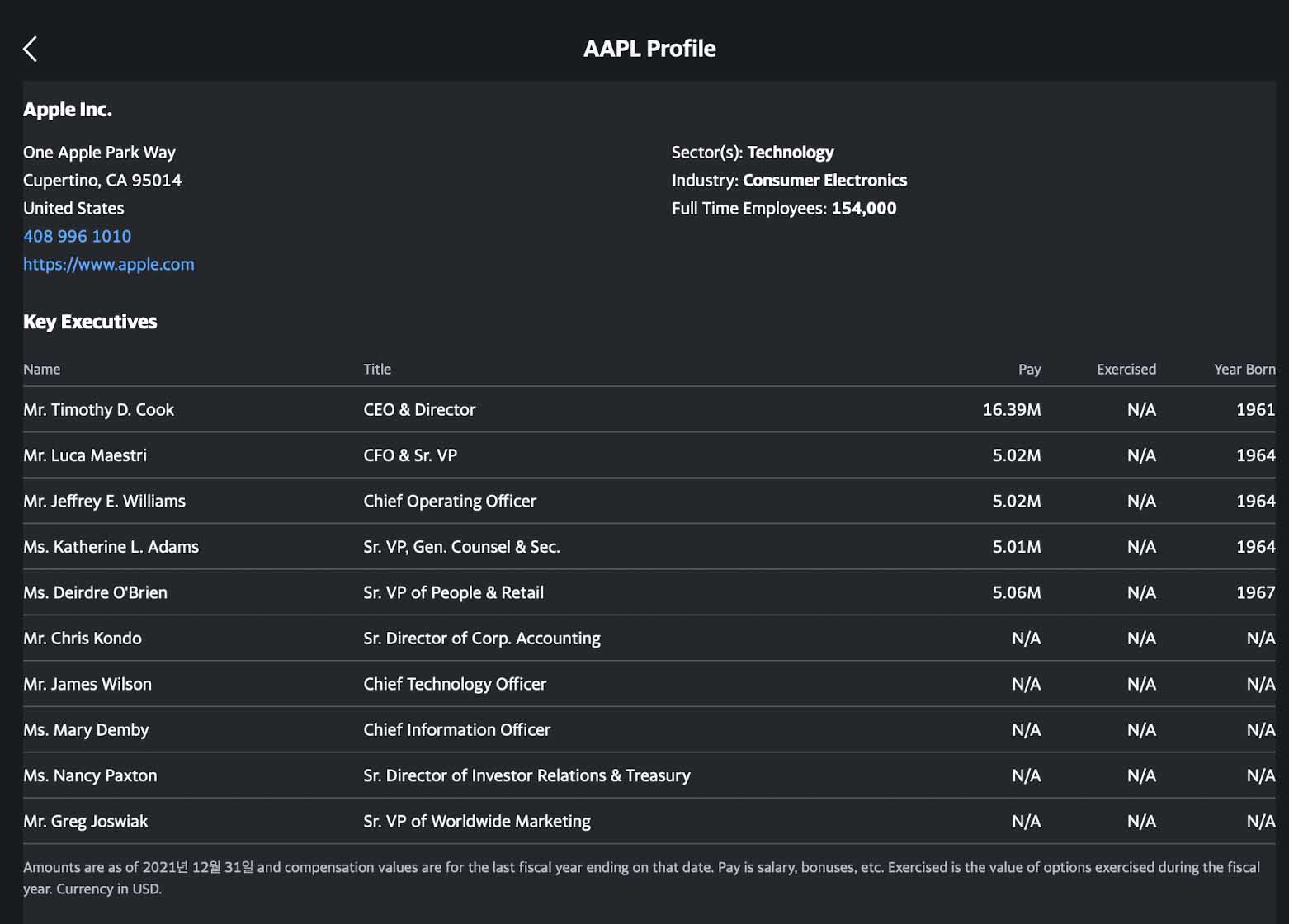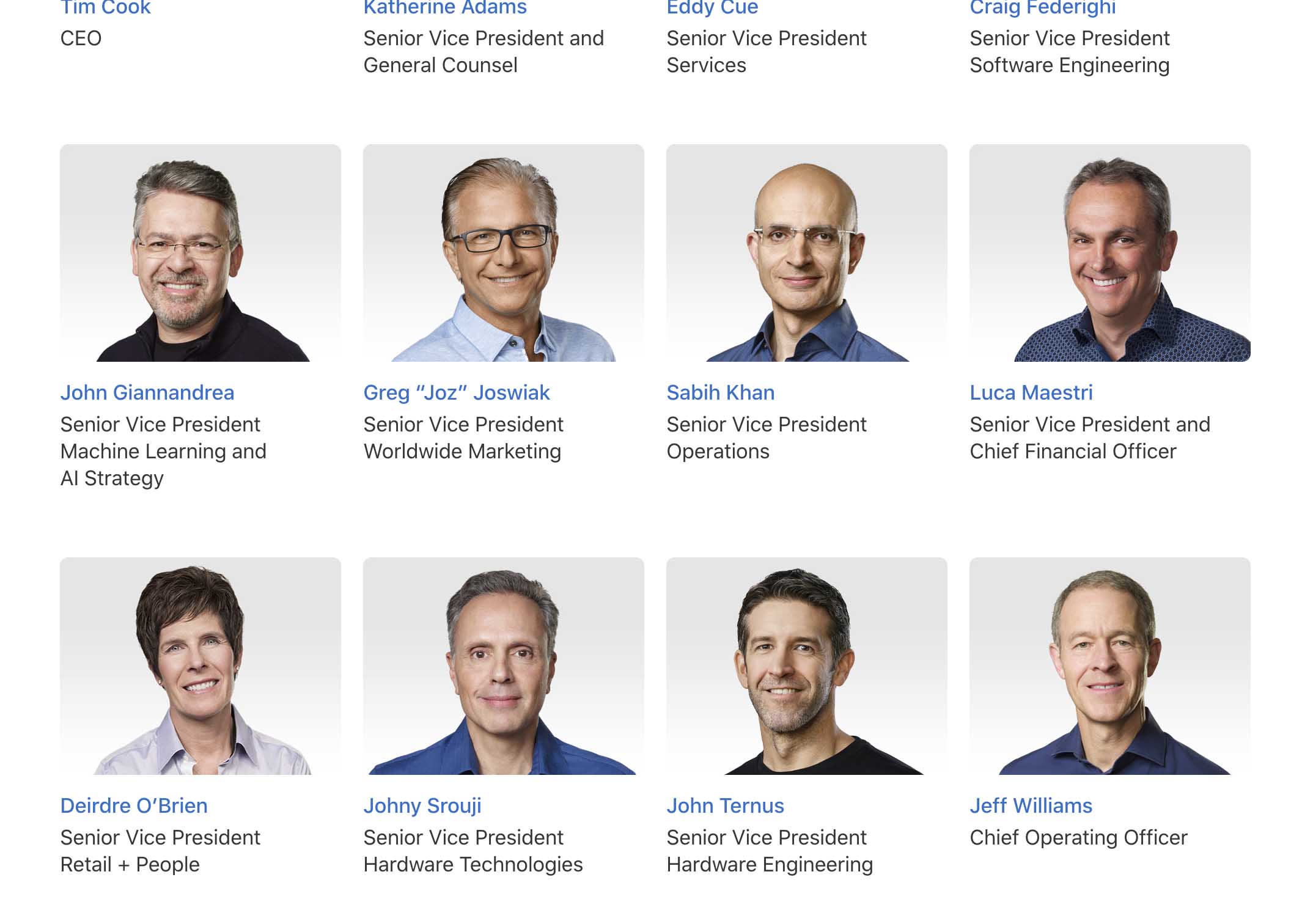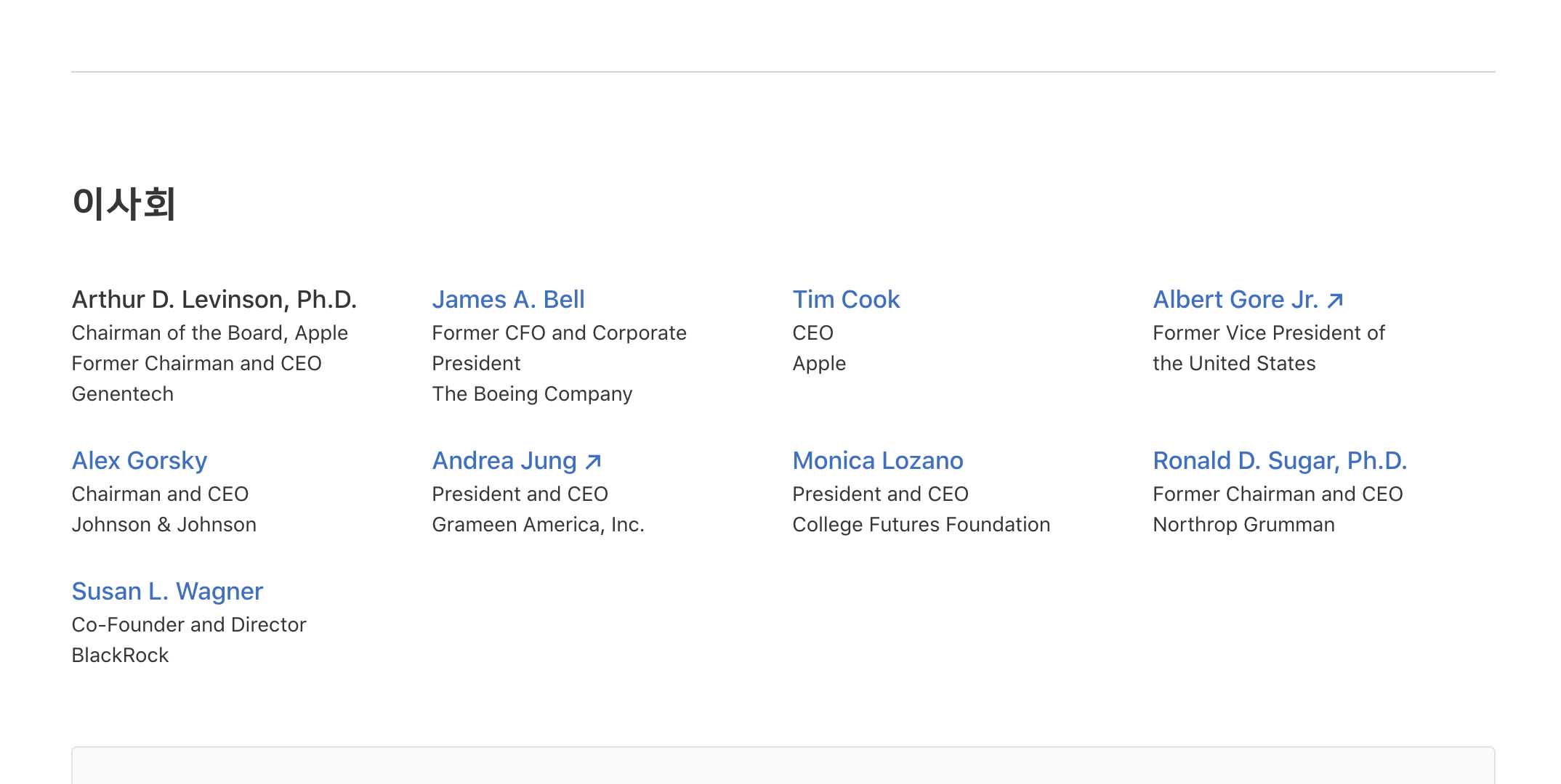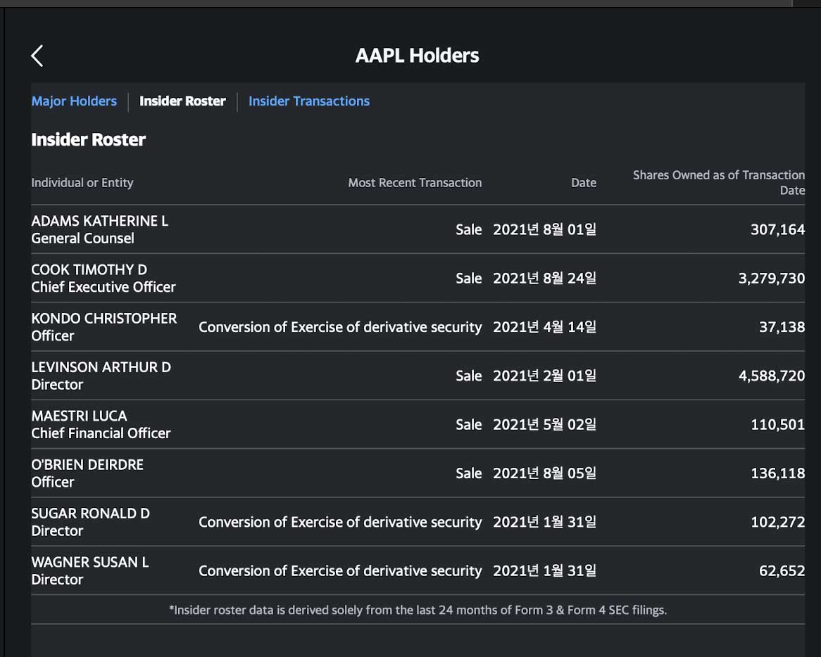 쿡 팀이 300만주 정도 보유하고 있다고 하니 6000억 정도 되는건가요. 작년에 꽤 많은 주식을 팔았다는 뉴스를 본 것 같습니다. 다른 인사이드 로스터들에 대한 정보입니다. 애플사이트에서 이사진으로 소개된 사람들이 꽤 보입니다.