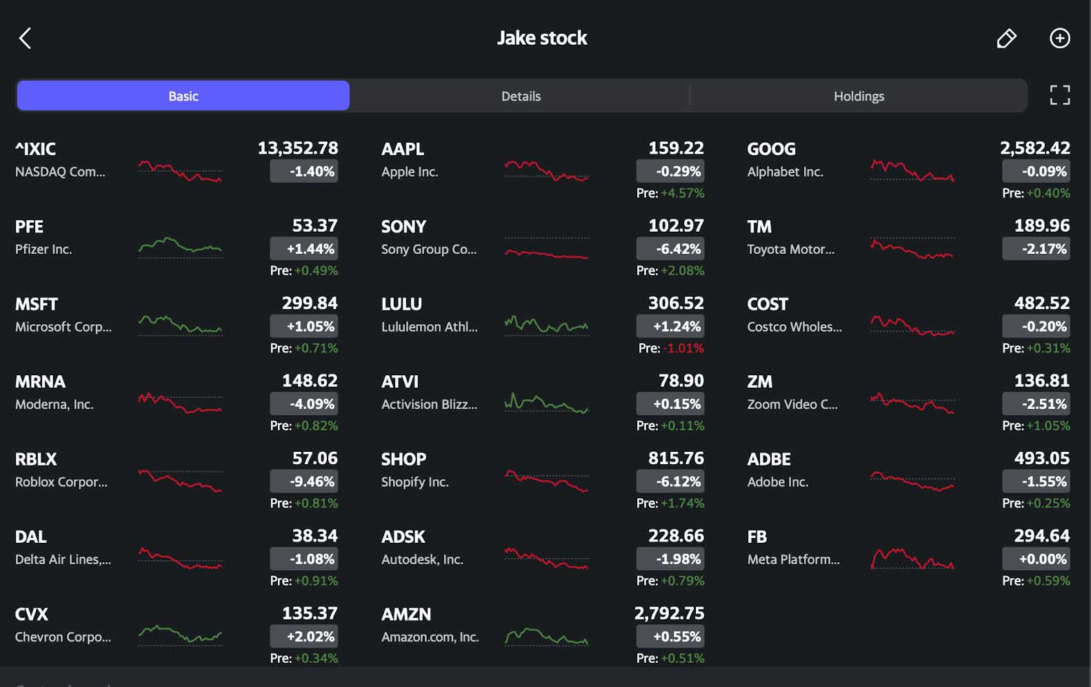 이중에서 현재는 주식을 집중하기로 해서 줌, 어도비, 페북, 아마존, 쉐보레, 오토데스크, 델타, 로블럭스, 쇼피파이, 액티비전블리자드 는 정리했고 애플, 마이크로소프트, 화이자, 코스트코 홀세일, 룰루레몬 애슬레티카, 모더나, 소니, 도요타, 알파벳C 이렇게 9개로 줄여서 포트폴리오를 구성하고 있습니다.