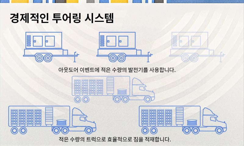 경제적인 투어링 시스템을 실형했습니다. 친환경적인 제품은 환경뿐 아니라 사업에도 도움이 되어야 현실성이 있는 것입니다. PANTHER는 무게가 가볍고 통당 소비전력을 현저하게 낮췄습니다. 이는 공연에서 더 적은 에너지를 사용함을 의미합니다. 무게가 가볍다는 것은 더 빨리 장비를 반입할 수 있다는 것을 의미하며 더 적은 노동력과 더 적은 시간으로 셋업이 가능하다는 것을 의미합니다. 환경에도 도움이 되지만 비용도 줄일 수 있는 1석2조의 효과를 습니다.
