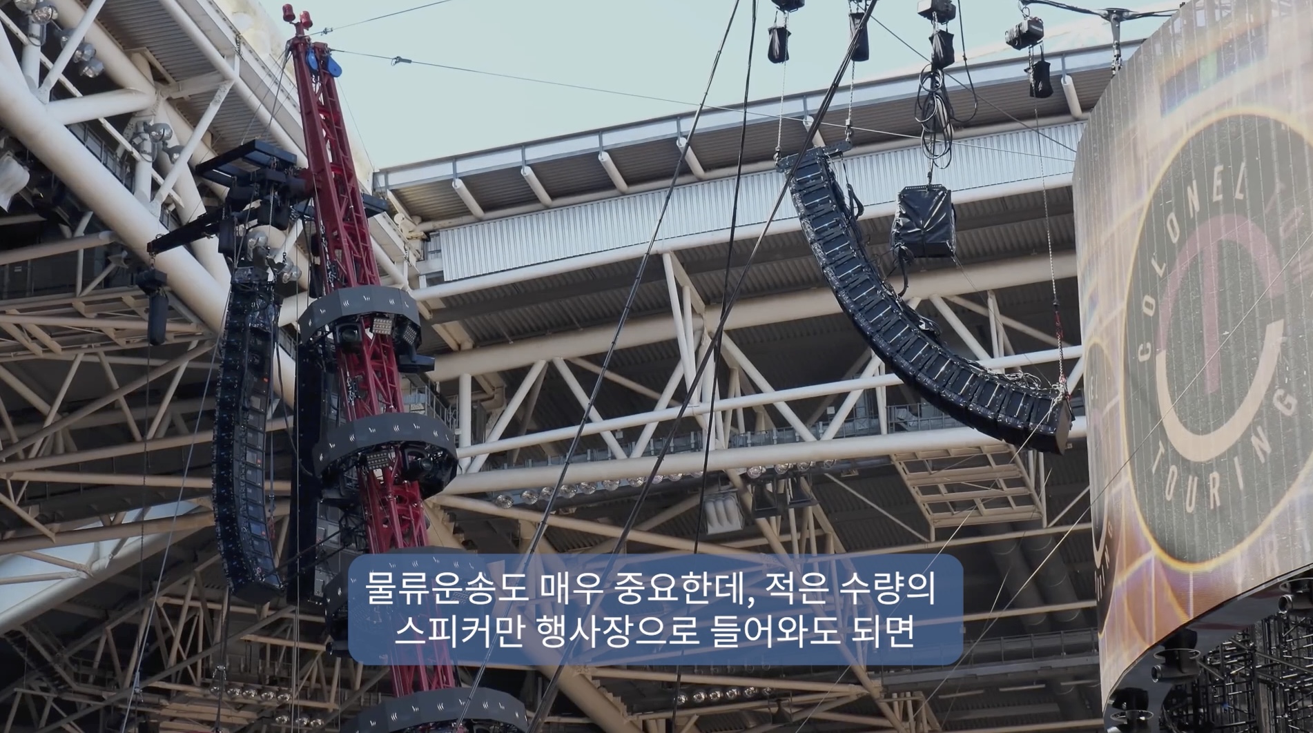 청중에게 도달하는데 필요한 에너지와 커버리지를 얻기 위해 우리는 매우 많은 스피커를 걸어야 했는데 이는 매우 크게 보였습니다. 이는 공연 디자인 컨셉과는 맞지 않았습니다. 우리는 이제부터 더 가볍고 작은 스피커를 찾아야 된다는 것을 알게 되었습니다. 저는 John에게 물어볼 내용이 생각났습니다. 크리스가 찾는 새로운 제품에 대해서요.