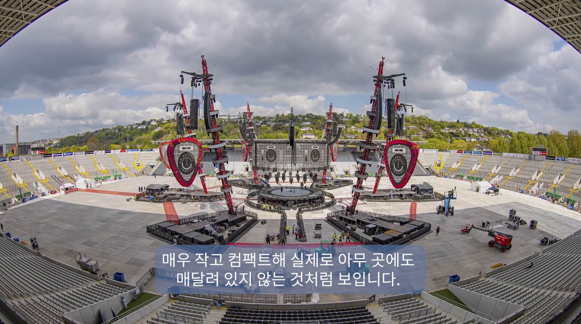 완전히 원점으로 돌아간 접근방식이에요. 우리는 모든 방향에 관객이 있는 360도 쇼를 생각하고 있었죠. 최소한의 공간사용과 시야라인을 확보하는 것이 중요했습니다. 이정도 사이즈의 시스템을 엠프를 사용하는 스피커로 운영하려면 많은 바닥 공간을 차지하게 됩니다. 팬서는 레오 같은 장거리 전송 스피커이지만 더 넓은 지향각을 가져 더 적은 수의 어레이로 더 많은 좌석을 커버할 수 있죠. 케이블과 설치해야 하는 각종 인프라의 양도 많이 줄어들지요. 전원과 신호 케이블만 연결하면 되고 다른 대형 케이블이 필요 없지요.