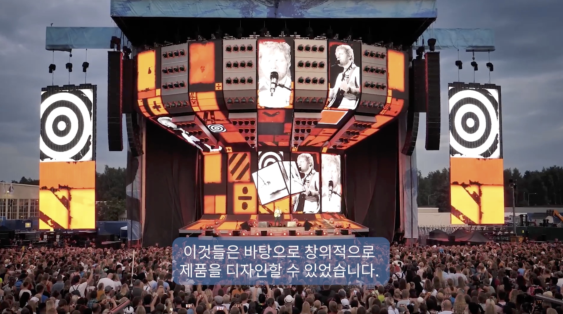청중에게 도달하는데 필요한 에너지와 커버리지를 얻기 위해 우리는 매우 많은 스피커를 걸어야 했는데 이는 매우 크게 보였습니다. 이는 공연 디자인 컨셉과는 맞지 않았습니다. 우리는 이제부터 더 가볍고 작은 스피커를 찾아야 된다는 것을 알게 되었습니다. 저는 John에게 물어볼 내용이 생각났습니다. 크리스가 찾는 새로운 제품에 대해서요.