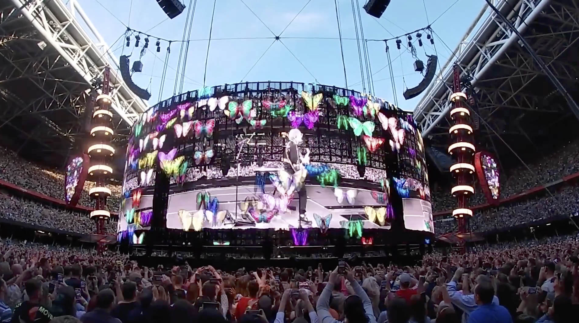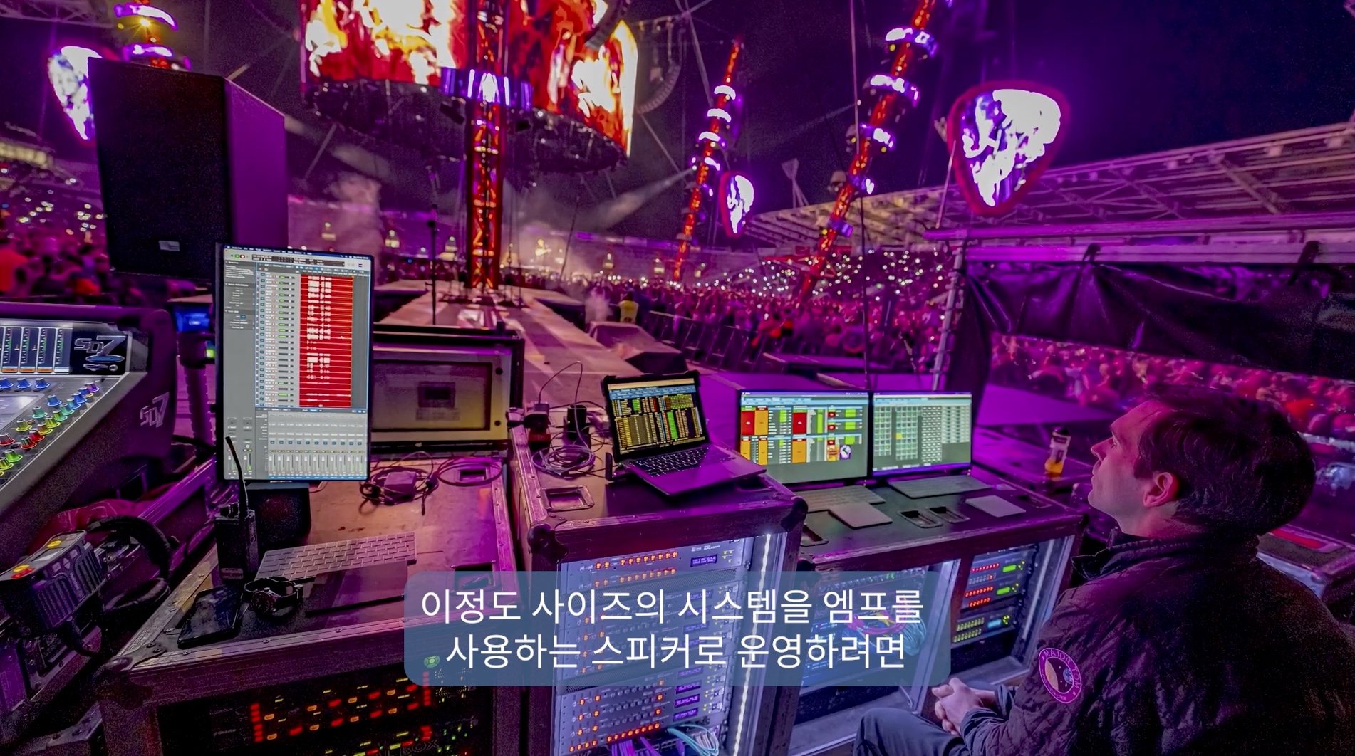 완전히 원점으로 돌아간 접근방식이에요. 우리는 모든 방향에 관객이 있는 360도 쇼를 생각하고 있었죠. 최소한의 공간사용과 시야라인을 확보하는 것이 중요했습니다. 이정도 사이즈의 시스템을 엠프를 사용하는 스피커로 운영하려면 많은 바닥 공간을 차지하게 됩니다. 팬서는 레오 같은 장거리 전송 스피커이지만 더 넓은 지향각을 가져 더 적은 수의 어레이로 더 많은 좌석을 커버할 수 있죠. 케이블과 설치해야 하는 각종 인프라의 양도 많이 줄어들지요. 전원과 신호 케이블만 연결하면 되고 다른 대형 케이블이 필요 없지요.