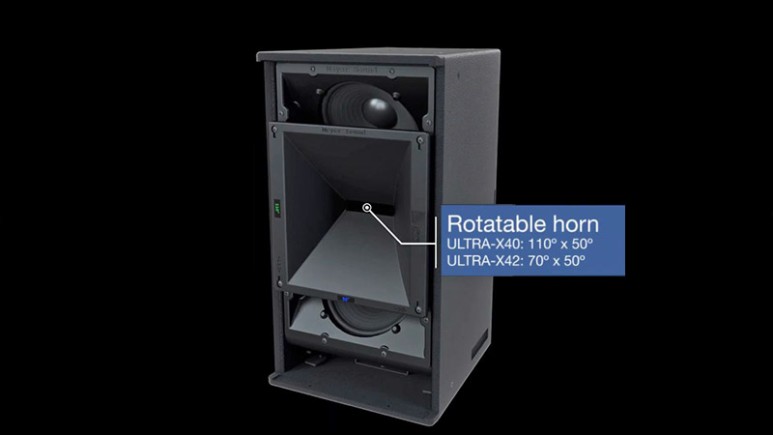 두개의 혼 옵션을 통해 시스템 설계를 매우 유연하게 할 수 있습니다. Ultra -X40의 회전이 가능한 110도 x 50도 Constant-Q 혼은 커버리지 영역 전반에 걸쳐 균일한 응답을 제공합니다. 만약 좁은 커버리지가 필요한 경우에는 60도 x 50도 커버리지를 제공하는 ultra-X42 옵션을 선택하면 됩니다.