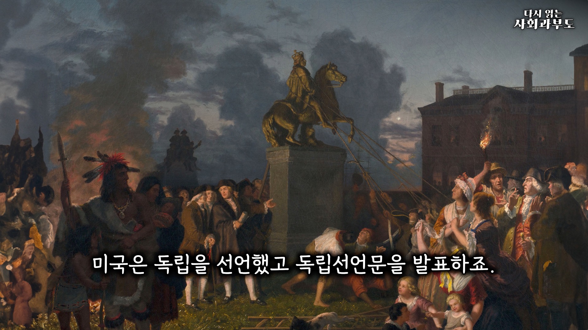 1776년 7월에는 독립을 선언했고 독립선언문을 발표하죠. 뉴욕의 조지3세 동상은 철거되죠. 1776년 12월 조지 워싱턴이 델라웨어 강을 건너고 트렌턴 전투에서 헤센 군대에 대한 미국의 주요 승리에 미국의 사기는 크게 고양됩니다. 미국과 영국 간의 전투를 주로 끝낸 사라토가 전투와 요크타운 포위전도 전쟁 중 중추적인 사건이었습니다.